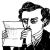 Description: edgar allen poe examining a letter suspiciously.